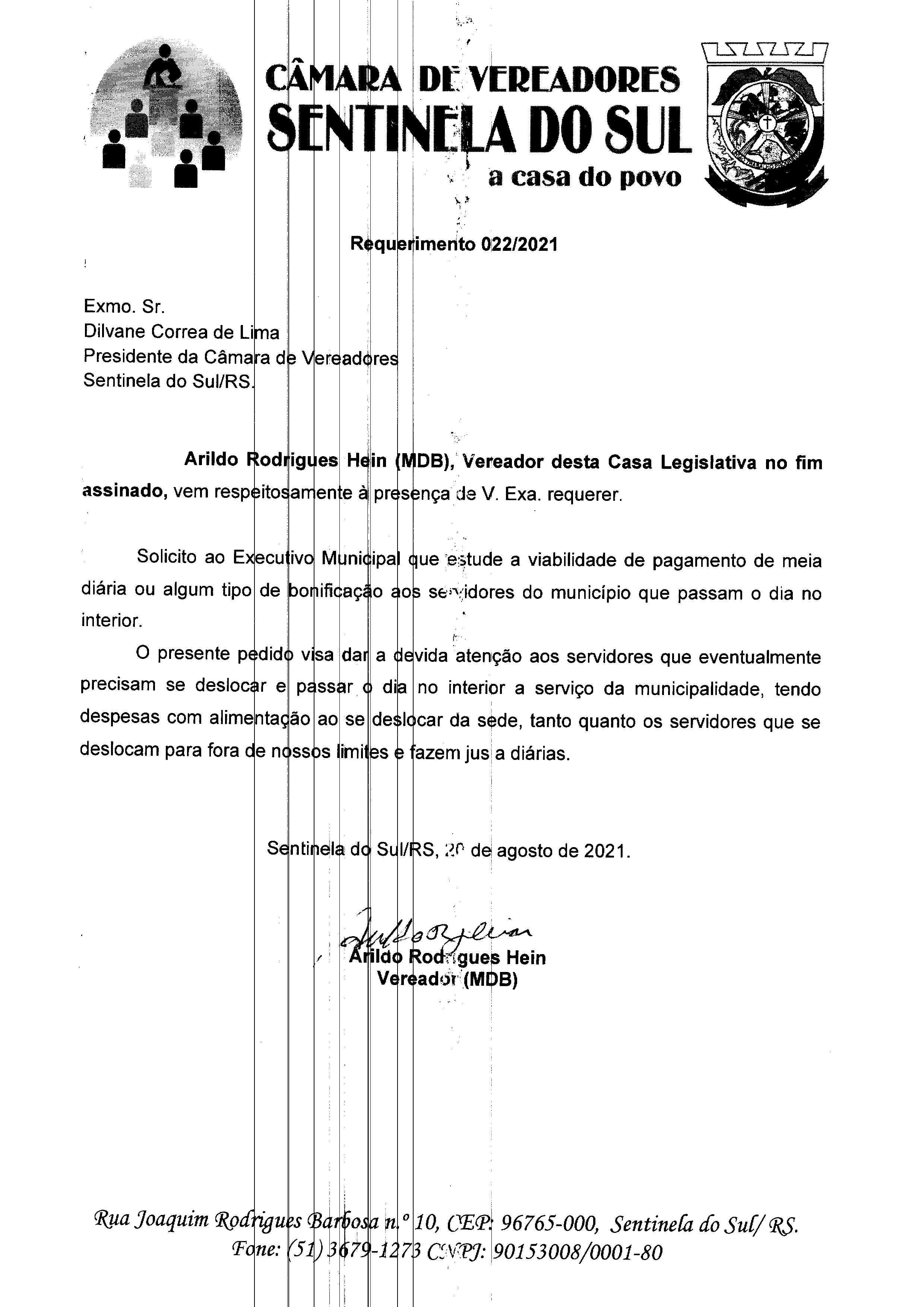Requerimento de autoria do vereador Arildo Rodrigues Hein