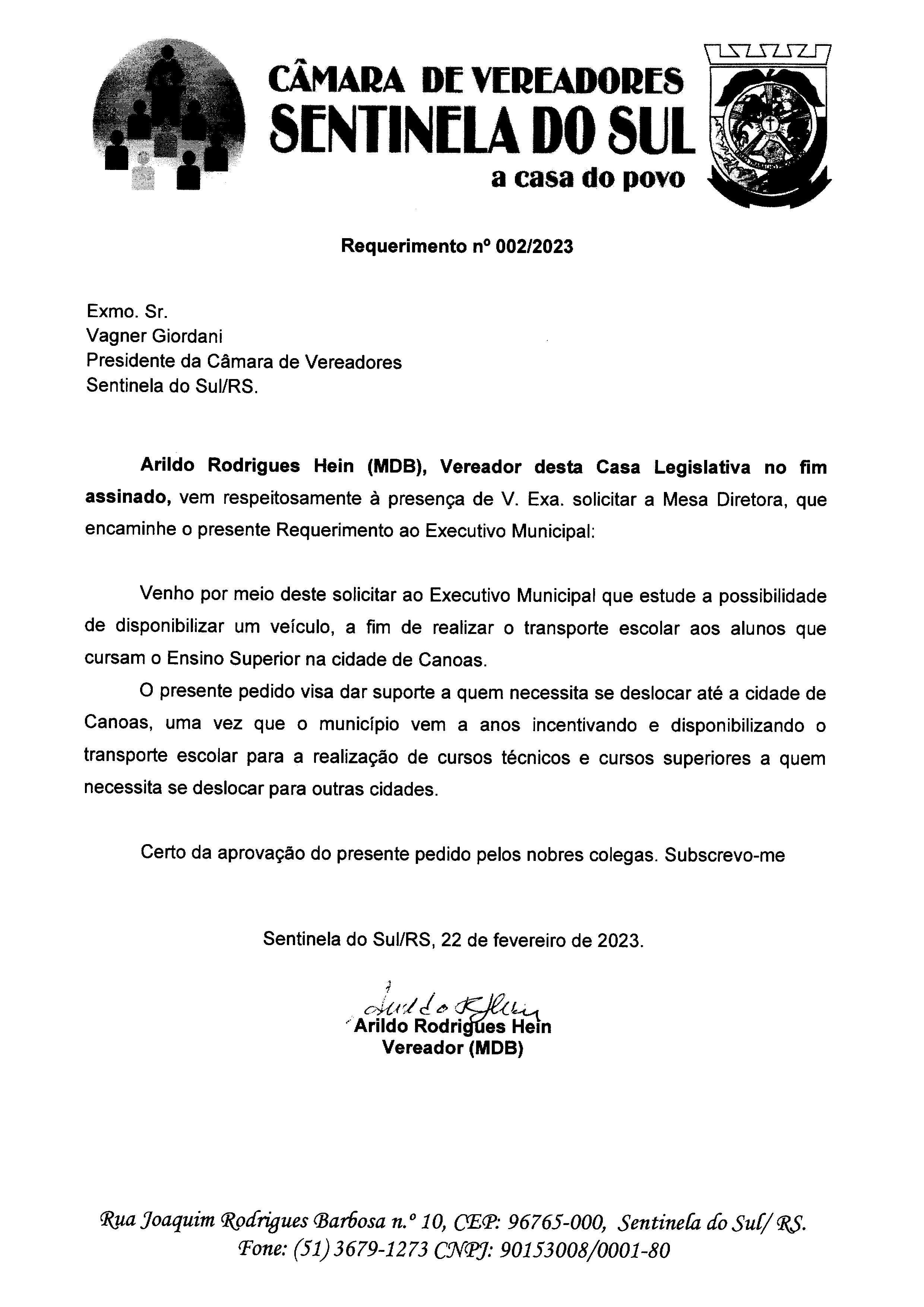 Requerimento de autoria do vereador Arildo Rodrigues Hein