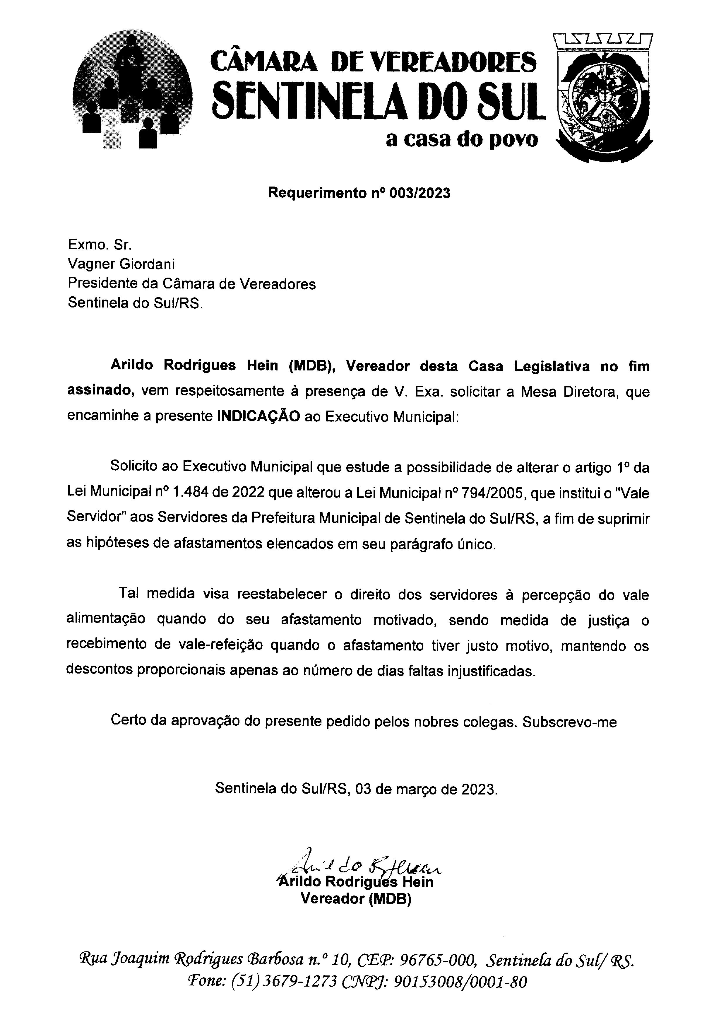 Requerimento de autoria do Vereador Arildo Rodrigues Hein