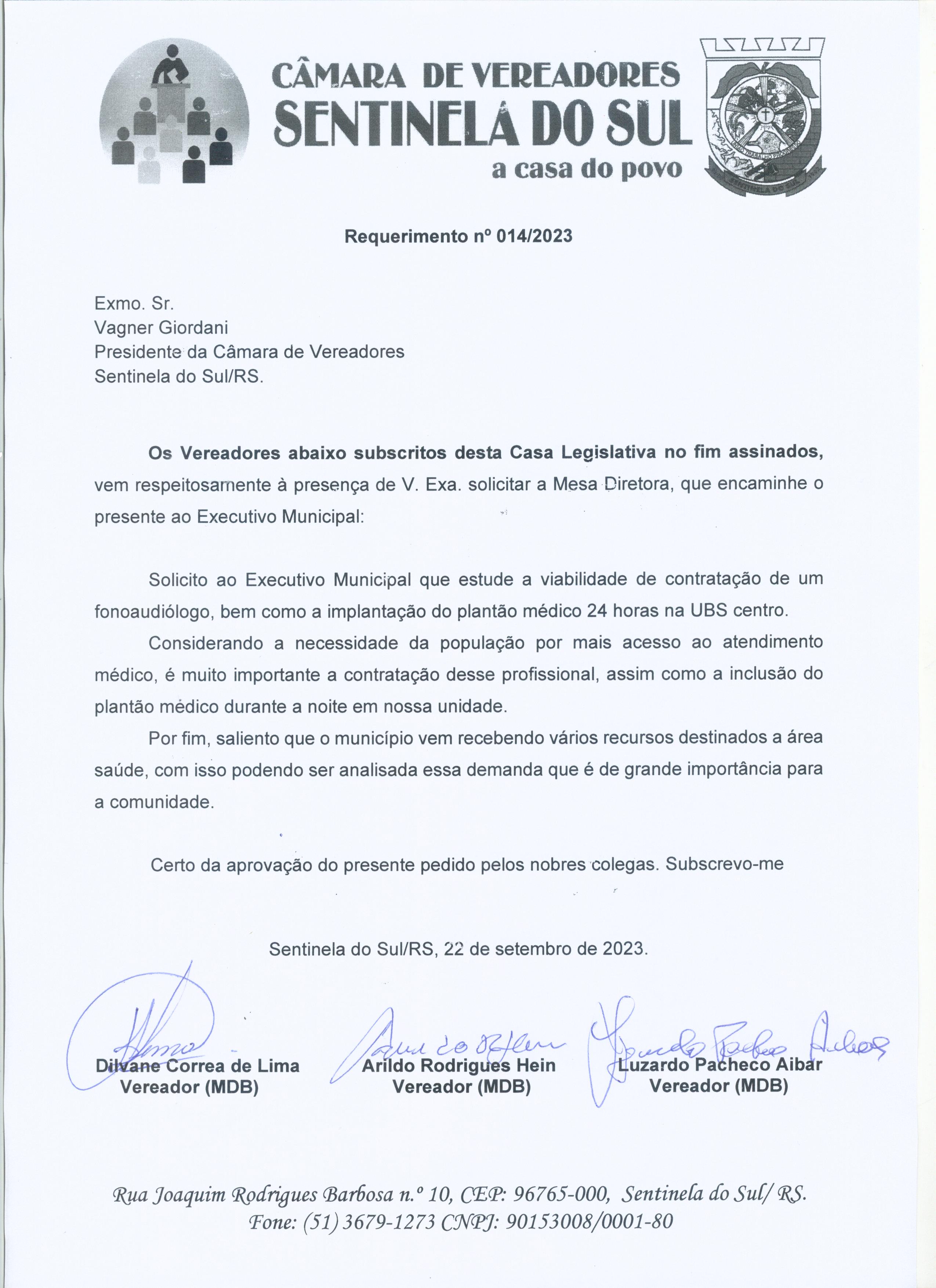 Requerimento de autoria dos Vereadores Dilvane Correa de Lima, Arildo Rodrigues Hein e Luzardo Pacheco Aibar