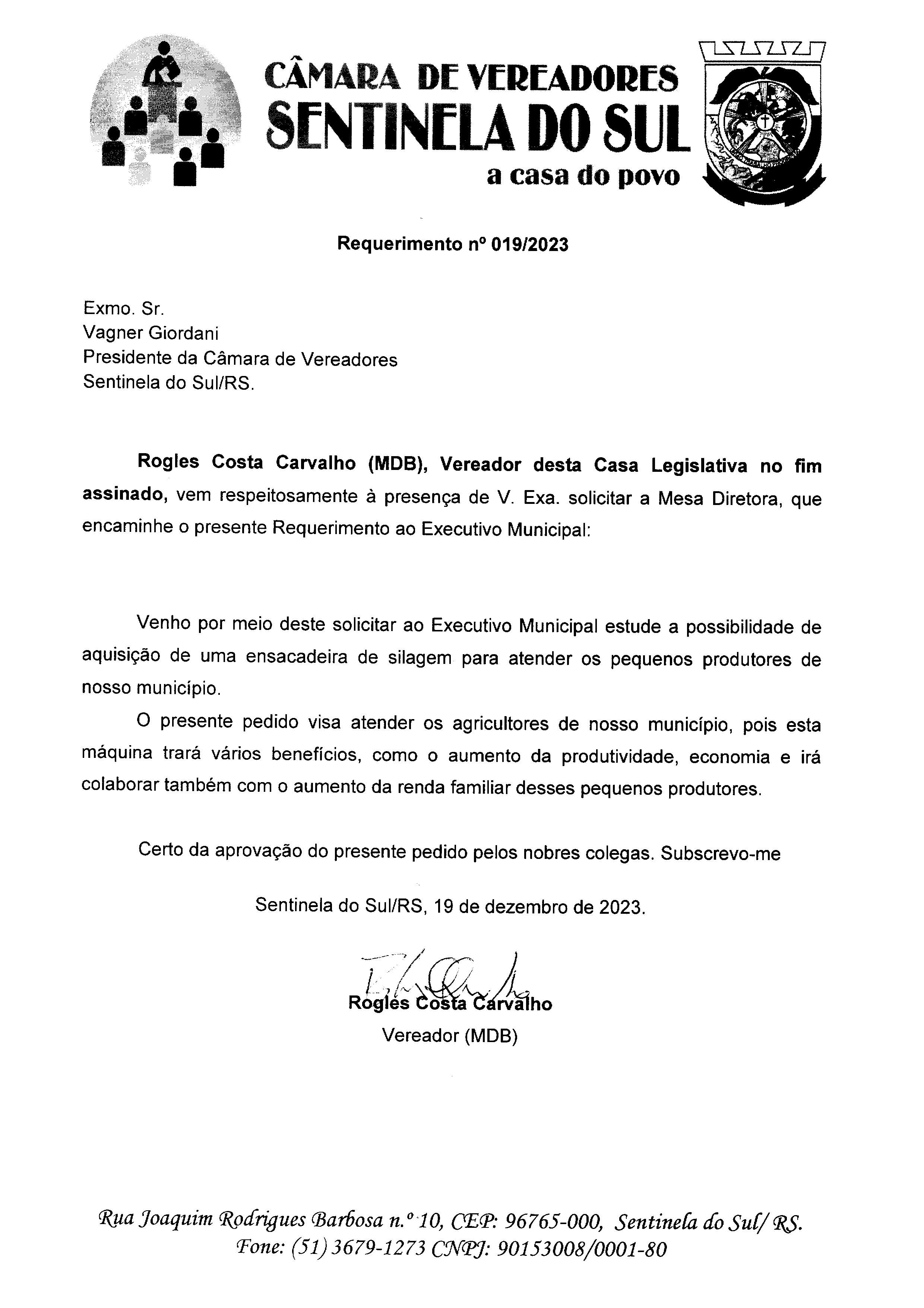 Requerimento de autoria do Vereador Rogles Costa Carvalho