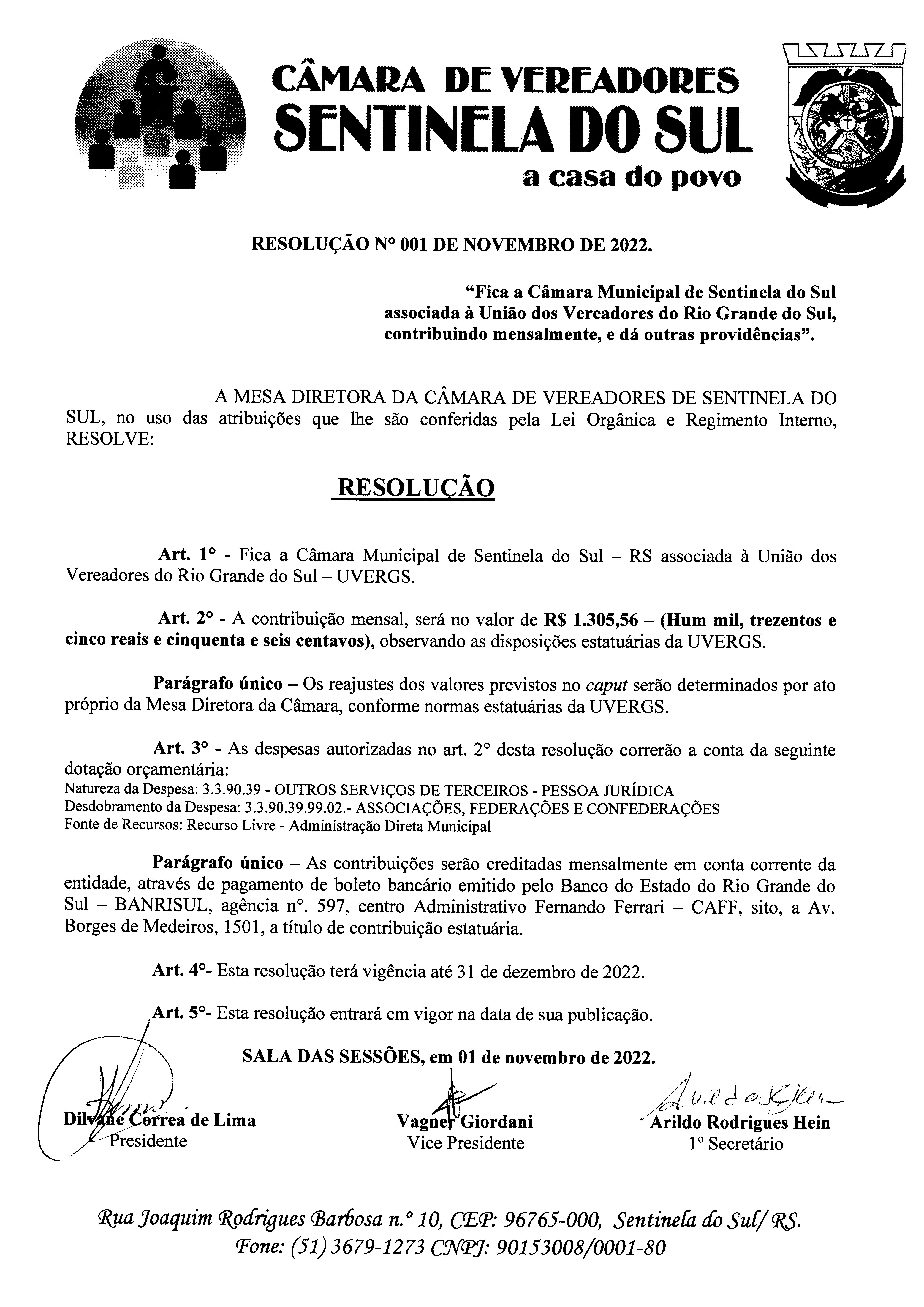 "Fica a Câmara Municipal de Vereadores de Sentinela do Sul associada a União dos Vereadores do Rio Grande do Sul contribuindo mensalmente, e dá outras providências."