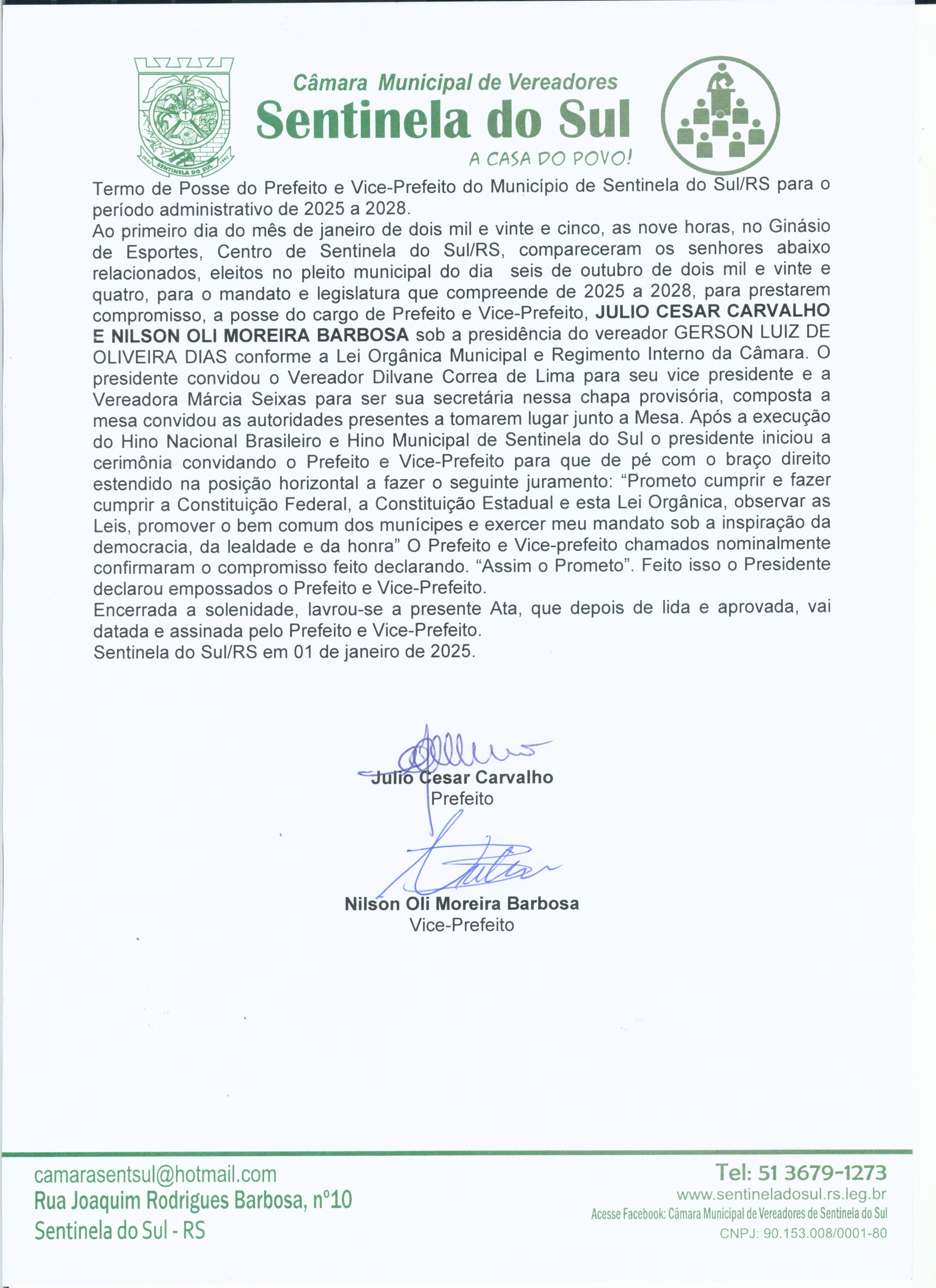 Termo de Posse Prefeito do Município de Sentinela do Sul/RS 2025/2028